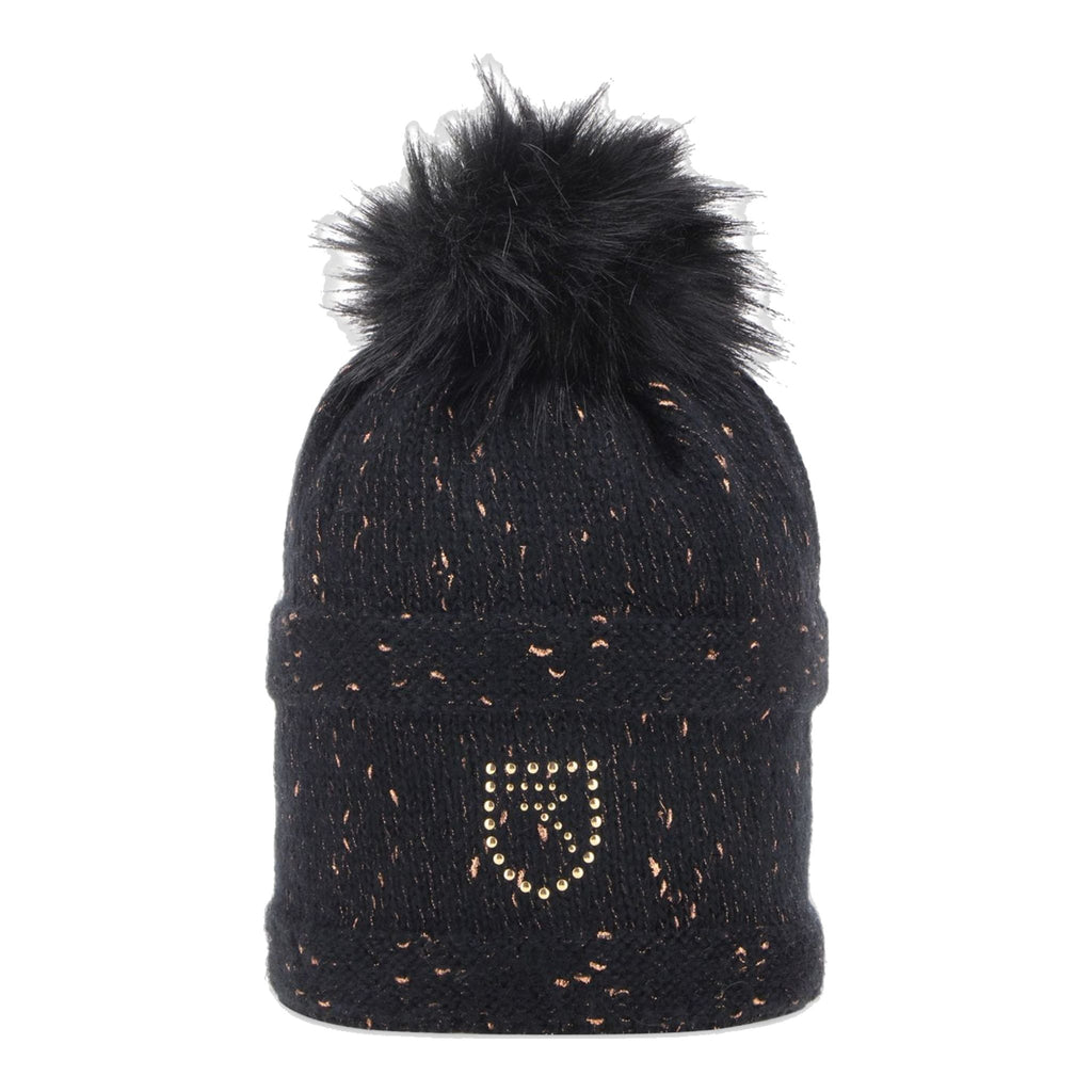 Material: Strickmaterial, Kunstfell-Bommel, Glitzerfäden, Strass-Logo